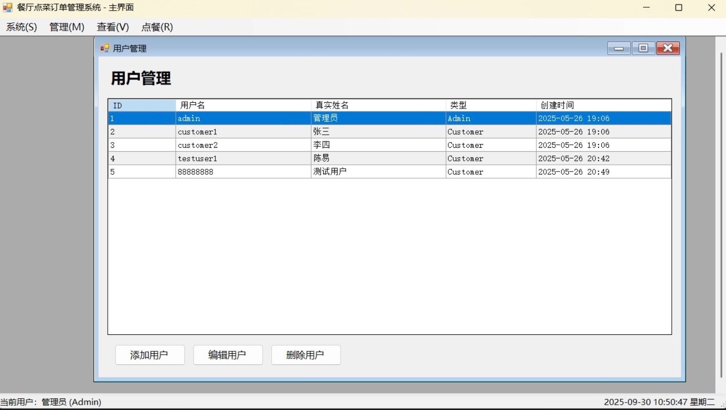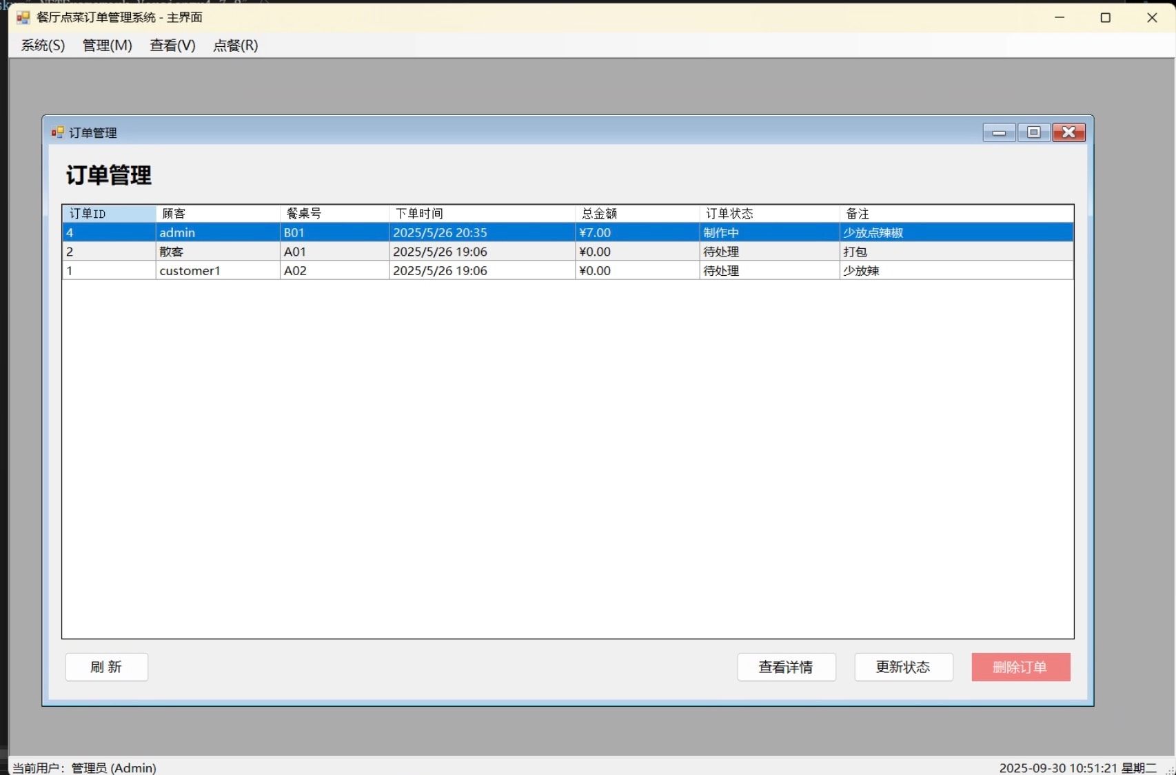 管理员端包含用户管理、菜单信息维护、餐桌状态设置及订单全流程监控;用户端则提供菜品浏览、在线点餐等功能,界面简洁直观,操作流畅。