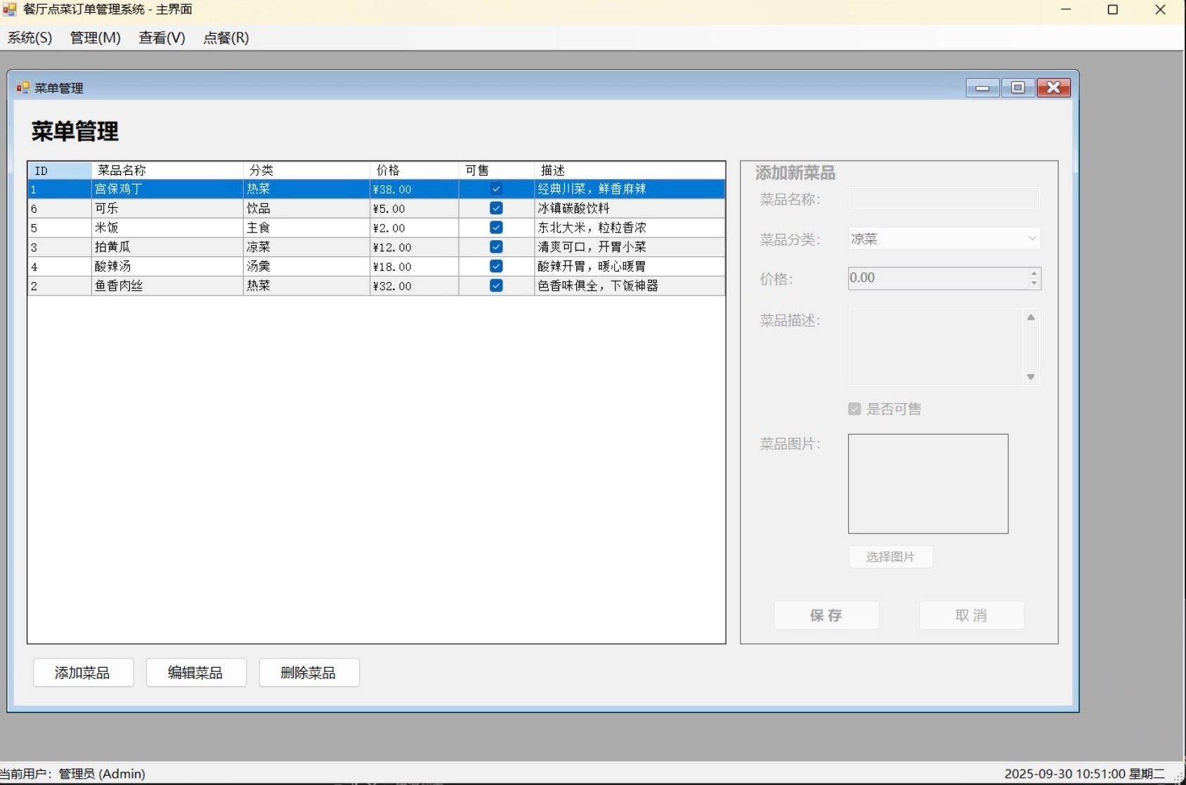 管理员可对系统中的用户账号进行添加、删除与权限分配;对菜品信息进行分类管理、价格调整与上下架操作;统一管理餐厅餐桌状态(空闲/占用/预定);并能查看所有订单记录,支持按时间、桌号等条件查询,便于经营分析。