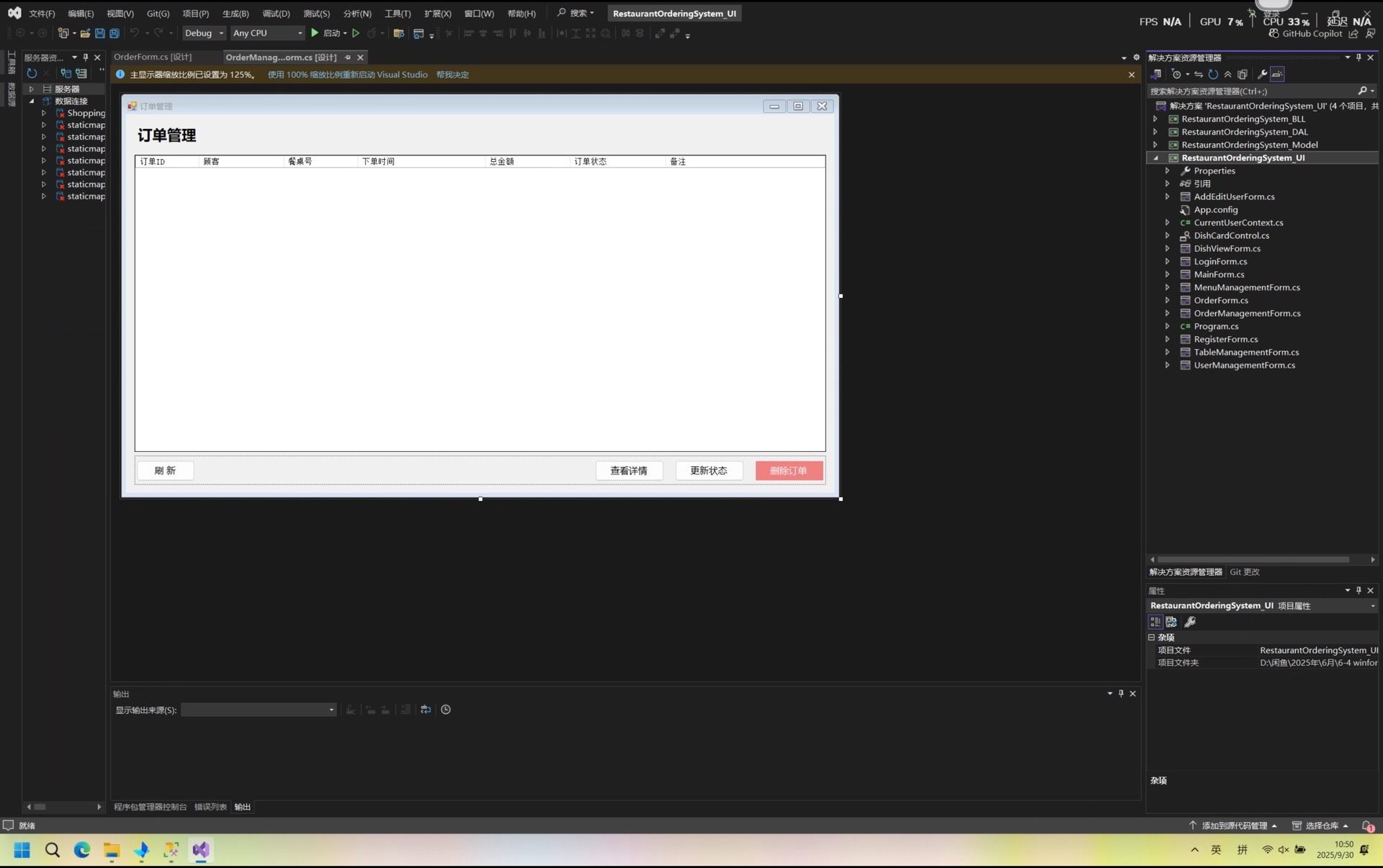 本系统是一款基于C#语言和WinForm技术构建的餐厅点餐与订单管理平台,采用经典的三层架构(表现层、业务逻辑层、数据访问层)进行开发,结构清晰,易于维护与扩展。