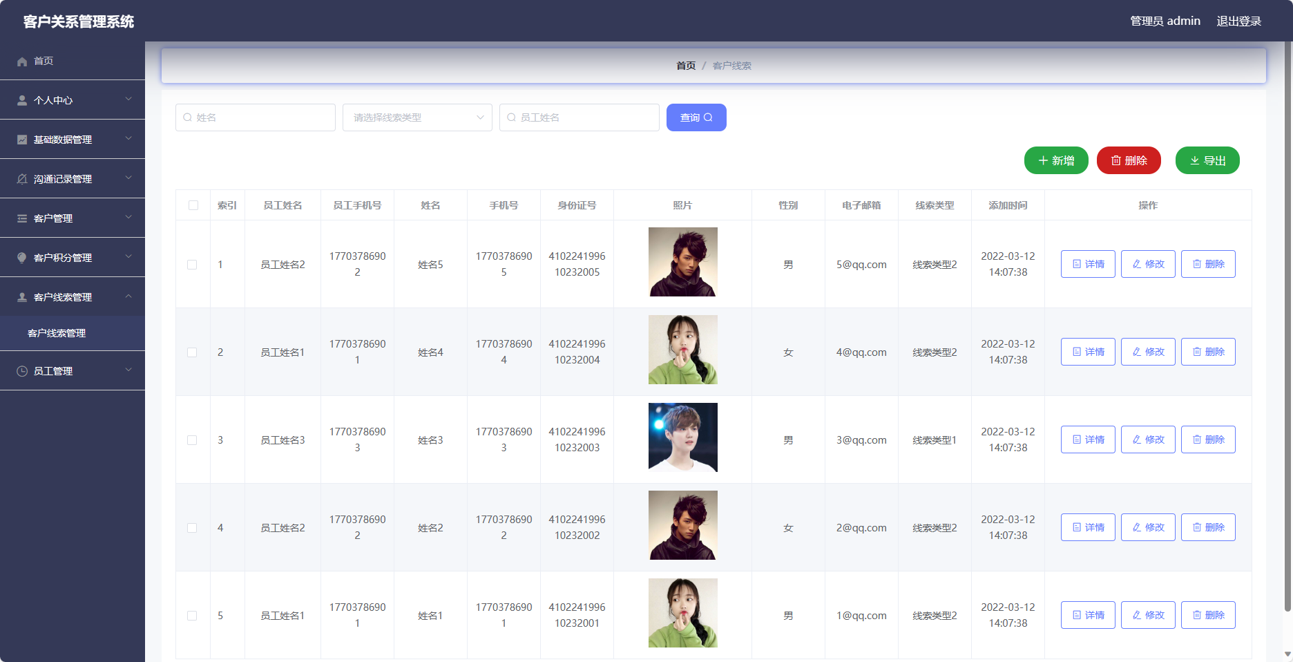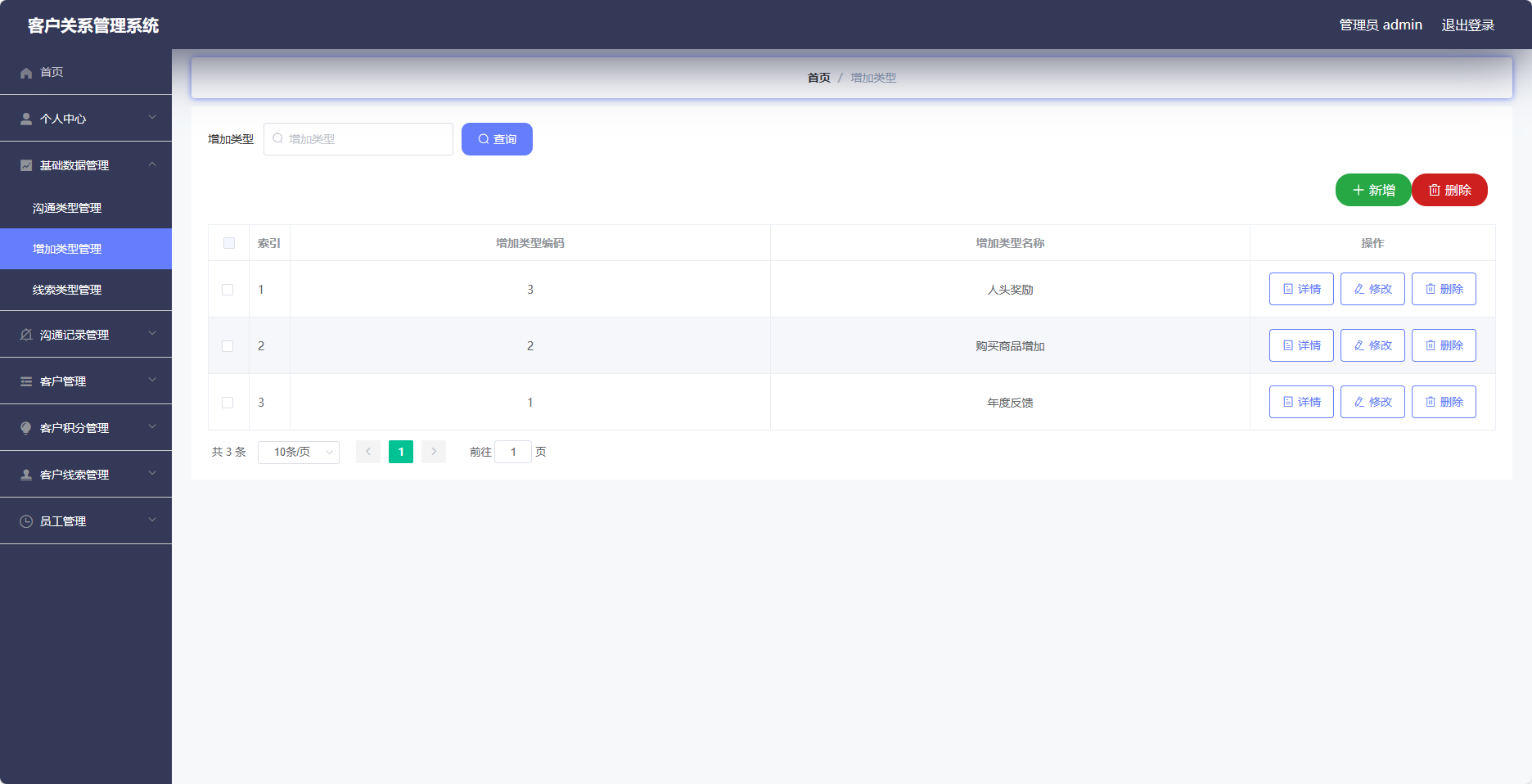 管理员可访问个人中心修改账户信息;管理基础数据如客户分类与产品资料;全面掌控客户线索、沟通记录与积分变动;并对客户档案与员工信息进行增删改查,实现组织级资源统筹。
