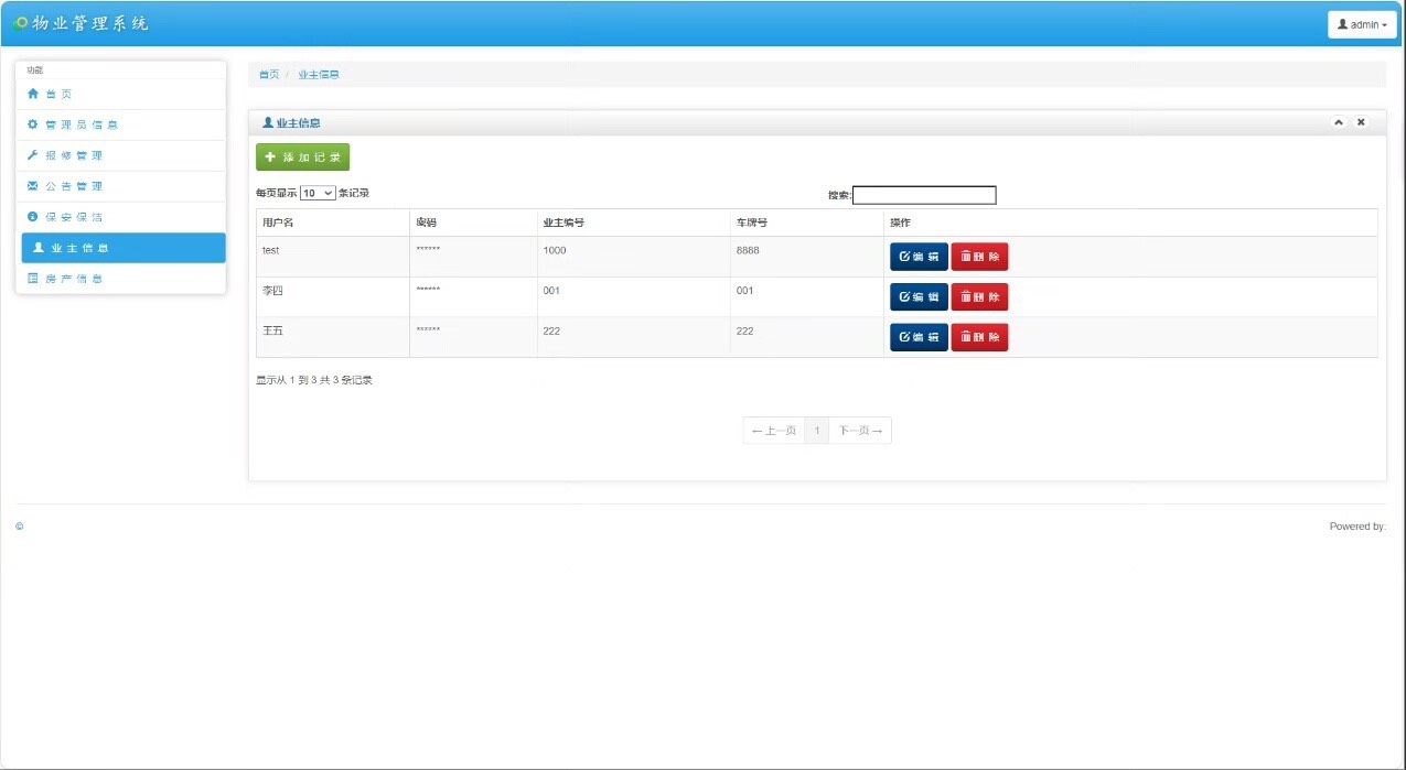 管理员拥有全面的后台管理权限,而业主则可进行日常信息查询与服务申请,满足典型物业管理场景需求。