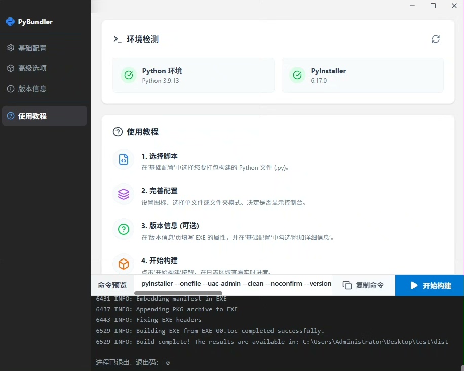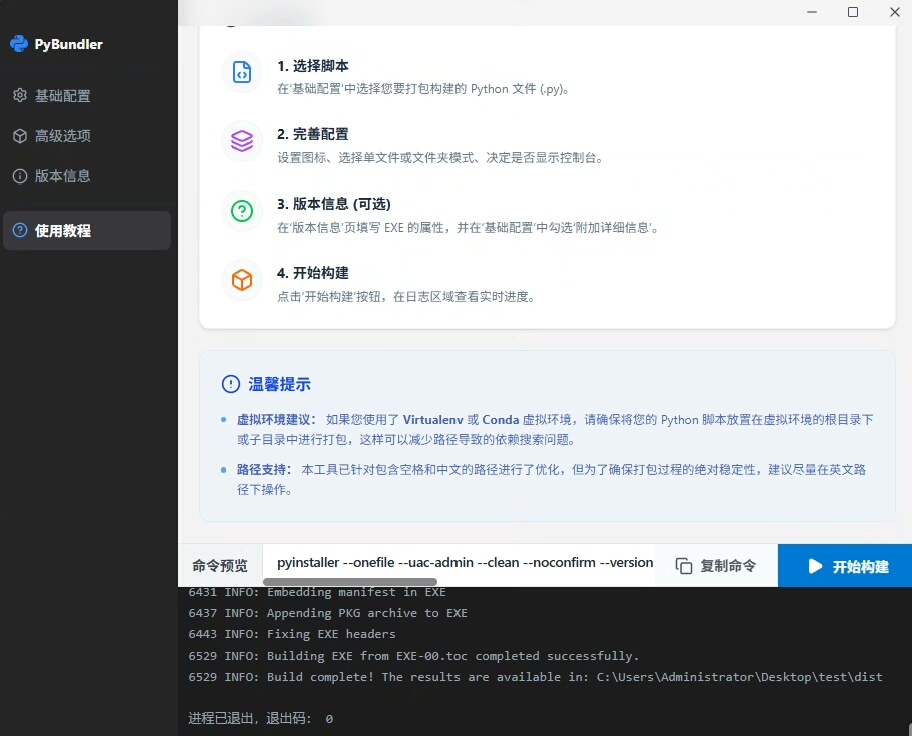 所有配置完成后,只需点击“开始构建”按钮,工具将自动调用PyInstaller完成整个打包流程,无需手动输入任何命令,真正实现一键式生成可执行文件。
