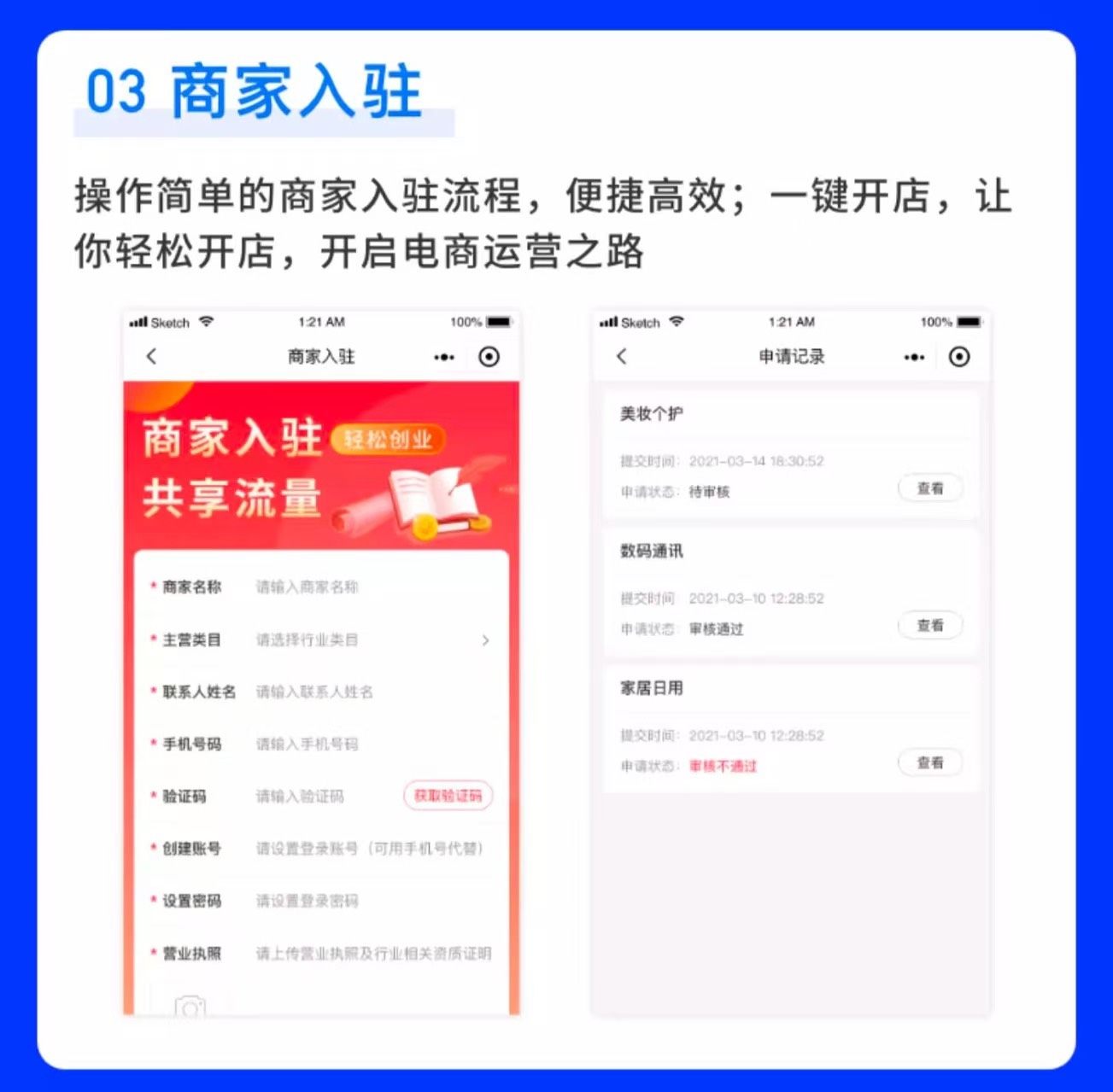 该系统完美支持平台自营、联合经营、招商加盟以及商家独立入驻等多种运营形态。