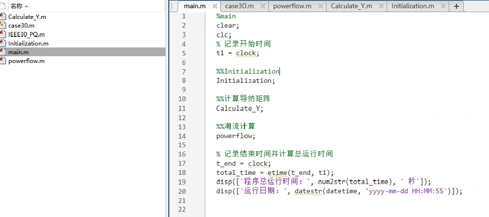 代码主要由三大函数构成:Initialization(初始化)、Calculate_Y(导纳矩阵构建)和Powerflow(潮流求解)。