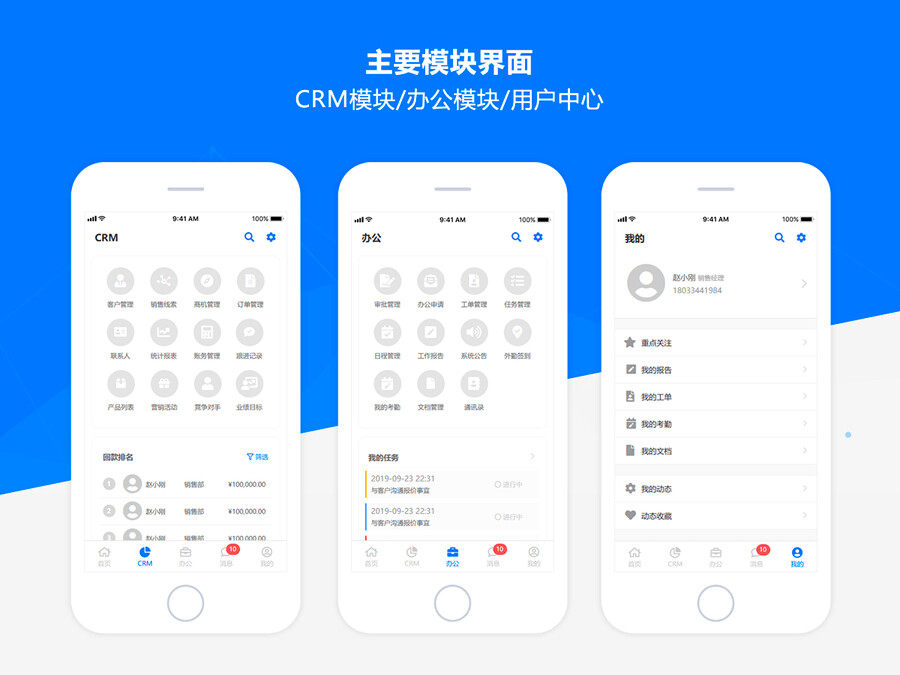 在整套原型设计中,CRM与办公两大模块占据核心地位,功能覆盖企业日常运营的关键环节。
