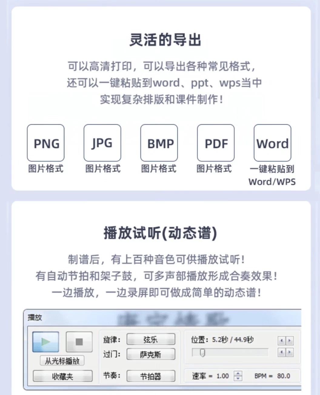 该软件支持乐谱播放、多声部编写,输出无水印的高清图像或PDF文件,可广泛应用于教学、演出及出版场景。