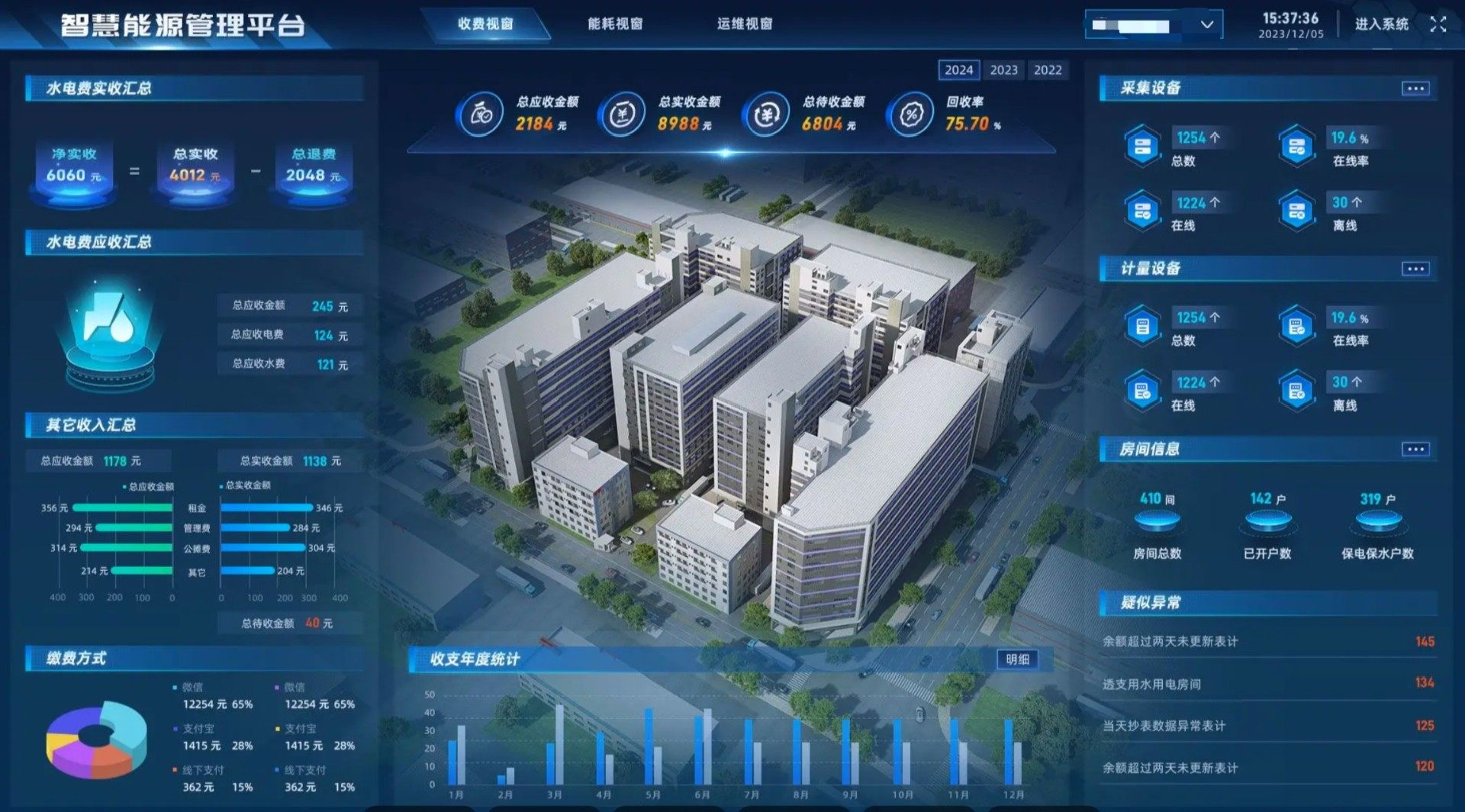 系统可实时采集电力、燃气、水力、热能等多种类型能耗数据,通过高清晰度可视化界面动态展示各设备及区域的用能情况。