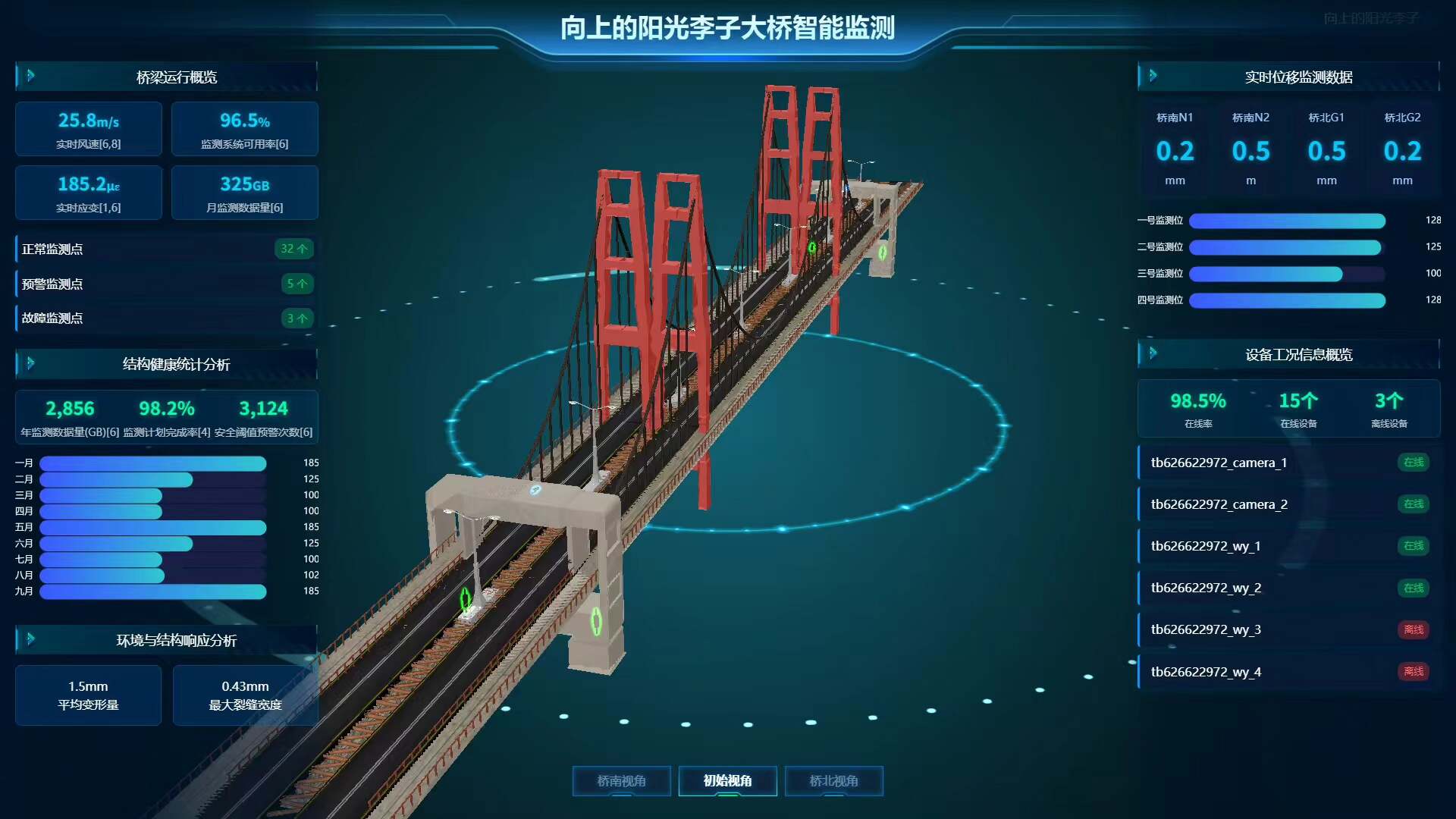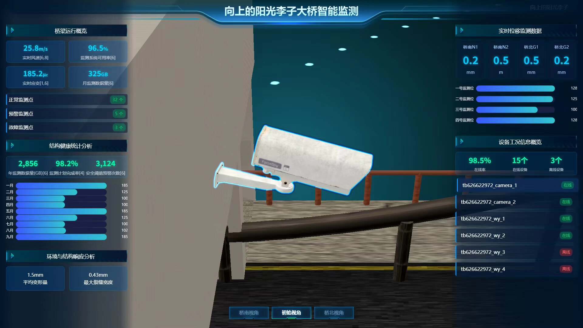 智能运维管理:系统内置自动巡检机制,支持桥南、桥北等多视角自由切换,异常设备自动高亮闪烁提示,提升运维响应效率。